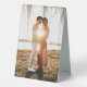 On the reverse side, the table tent showcases a photo of the couple. . This dual-sided table tent, displaying the wedding timeline icons on one side and a carefully selected couple's image on the other, will serve as a captivating centerpiece at the reception.