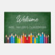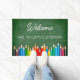 A modern classroom welcome doormat for teachers featuring a green chalkboard background with colourful coloured pencils.