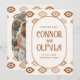 A modern western wedding Save the Date featuring warm neutral tones and bold southwest-inspired patterns. Perfect for ranch, desert, or outdoor weddings with a semi-formal western feel. Available as professionally printed invitations or a convenient digital file for easy sharing.