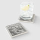 The coasters are gorgeous, a quality feel and heavy weight. They look like a precious archeological find. A rustic stone juxtaposed with a modern floral black and white print. I like the way the print goes slightly imperfect on the cut stone edges giving them a kind-of natural beauty.
