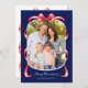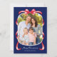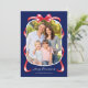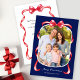 This whimsical Christmas photo card showcases a curved picture, elegantly adorned with a charming red bow and ribbon on a dark blue background. The back offers space for custom text, allowing you to add a personal touch to your message.