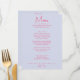 A colourful retro funky modern bright wedding dinner menu. Which features chic template design of boho vintage periwinkle background and bright pink typography and hand written menu in pink . Perfect and matching with the whole whimsical hand lettered suite vibe.