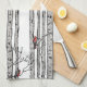 This modern kitchen towel features hand-drawn birch trees with red Cardinal birds perched on branches in black ink, with shading done in cross-hatch style, against an elegant white background.