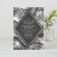 This modern and trendy Wedding invitation is perfect for the stylish, elegant, and bold couple. Its contemporary colours and design composition are a modern and chic twist on a summer tropical theme. Its comprised of a geometric black chalkboard and faux printed gold foil bordered diamond cut frame on top of black palm frond leaves and a white background. On the back features a personalised monogram, adding that extra special touch to your invites.