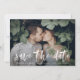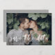 Modern save the date card featuring "Save the Date" displayed in a white, watercolor script overlaying your full-bleed horizontal engagement photo. Personalise the front of the photo save the date with your names, wedding date, wedding location, etc. The card reverses to a solid grey background or colour of your choice. Add additional text and images for a one-of-a-kind design! Available for instant download, printed cards, or both.