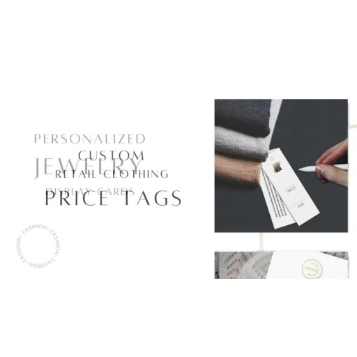 This price tag does much more than tell the customer the price of the clothing item. It has your business logo, your social media name and your website. You can also add your favorite tag line. This is on a white background.