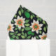 A beautifully intricate pattern graces a black background, showcasing a blend of orange and white flowers accompanied by green leaves. The flowers, reminiscent of daisies, display delicate petals and vibrant hues that stand out against the dark backdrop. The leaves introduce a touch of freshness and natural beauty to the design. The overall composition is visually striking, with the colours creating a bold and eye-catching contrast. This floral pattern exudes elegance and sophistication, making it a captivating and aesthetically pleasing arrangement.