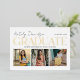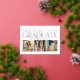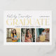 Two sided graduation announcement and grad party invitations feature a photo collage of 3 pictures on the front with modern and stylish real gold foil serif printing and white script typography design that can be personalised for the graduate. The back of the card features grad party graduation celebration information that can be customised for your special event. Includes a white background colour and soft black wording.