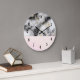 A light pink gradient background beneath the marbled pattern. Art deco style clock face.