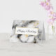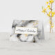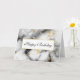 A happy birthday greeting card with a message inside. Designed with an elegant and modern marbled pattern. White, black and smoky grey marble with thin ribbons of faux-gold swirls throughout the pattern. A rectangle with a faux-gold-foil border and the text "Happy Birthday" written inside. A message inside which you can personalise.