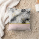 A pillow with an elegant and modern marbled pattern. White, black and smoky grey marble with thin ribbons of faux-gold swirls throughout the pattern. A light pink gradient background beneath the marbled pattern.