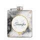 A flask with a classy, modern marbled pattern. White, black and smoky grey marble with thin ribbons of faux-gold swirls throughout the pattern.