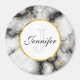 A white circle with a faux-gold frame layered over top with your monogram initial and name inside.