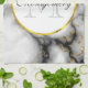 A white circle with a faux-gold frame layered over top with your monogram initial and name inside.