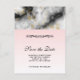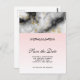 Wedding save the date postcard with an elegant and modern marbled pattern. White, black and smoky grey marble with thin ribbons of faux-gold swirls throughout the pattern. A light pink gradient background beneath the marbled pattern.