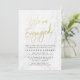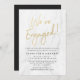 Stylish modern wedding engagement party invitations featuring a "We're Engaged" in a faux gold foil trendy script font, white marble background, and placeholders for your custom engagement party information. The back of the gold engagement party invites can be changed to a colour of your choice with the Customise tool.
