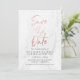 Stylish modern wedding save the dates featuring a faux rose gold foil trendy script font, white marble background, and placeholders for your custom wedding information. The back of the save the date can be changed to a colour of your choice with the Customise tool.