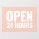 Let your customers know you're always open with this modern blush pink “Open 24 Hours” window cling. Featuring bold white text and a soft contemporary background, this adhesive sign is perfect for cafés, diners, gyms, and other around-the-clock businesses. Easily applies to the inside of glass windows and doors. A stylish, professional way to boost visibility and trust.