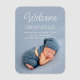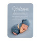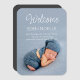 Modern, elegant white script photo birth announcement photo magnet featuring "Welcome" and baby's name and birth details in a modern sans serif typeface. This easy-to-customise baby photo magnet is a wonderful keepsake of your special, happy moment and a lovely gift for family and friends. © y.BEE PAPERIE #ZazzleMade #birthannouncement #babyannouncement #babyphotomagnet