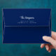 Modern navy blue envelope that features your family monogram name in a stylish white script and your return address in classic white serif typography.