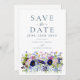 Stunning hand painted watercolor wildflowers and foliage wedding save the date invitation in navy blue, dusty blue, cornflower blue, navy blue, purple, pink, yellow, burgundy, magenta and green hues. Personalise the bride and grooms monogram initials on the back of the invitation. Ideal for a unique wedding save the date for a spring or summer wedding. Elegant modern typography script in navy blue complements the whimsical boho beautiful artwork which includes cornflowers, poppy, cosmos, forget me nots, daisy, billy button and delicate foliage. Chic bohemian wedding save the date invitations perfect for a spring meadow, summer garden wedding. Original artwork by artist Catherine Sweetman