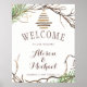 Elegant winter wedding stylish welcome sign poster template on simple clean white background featuring pine boughs, branches wreath, a stylised wooden Christmas tree with star, watercolor splashes and a fancy editable typography script. Fill in your information in the spots, You can choose to customise it further changing fonts and colours of lettering. ---- It is suitable for trendy winter country rustic, forest, nature, evergreen or Christmas weddings.
