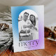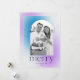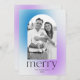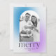 Unique, modern holiday card featuring your photo framed by a blue and purple gradient arch frame. "Merry" is displayed in simple charcoal grey lettering with your family's name and year shown below. The gradient holiday card reverses to display an additional photo with space for your custom message.