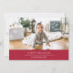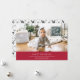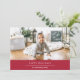 Modern, simple and minimal holiday photo card features your favourite horizontal or landscape orientated photo with a festive cranberry red bottom border. Your custom greeting appears in modern white lettering (shown with "Joy to the World"), with your family name or names beneath. A subtle snowflake pattern is overlaid over the edges of your photo for festive appeal. Cards reverse to a wintry woodland pattern of reindeer and snowflakes in dark grey on white.