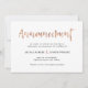 This fresh and modern card lets everyone know in a tasteful yet stylish manner that your upcoming wedding has been cancelled, postponed, or simply rescheduled. Trendy handwritten script says "announcement" across the top in faux rose gold, for a chic, black and white look with a classy black back.