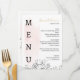 Impress your guests with this elegant wedding menu featuring a soft blush watercolor backdrop and refined black floral illustrations. The vertical “MENU” layout adds a modern, sophisticated touch, while the delicate design maintains a romantic and timeless feel. Perfect for any elegant, garden, or contemporary wedding theme, it completes your reception table styling with effortless beauty.