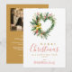 Modern Wreath Heart-Shape Merry Christmas Poinsettias, Holly Branches, Ribbon Photo Script Typography Holidays Cards.