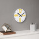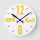 Modern yellow and black large numbers Round Clock. It displays the numbers 3, 6. 9 and 12 in yellow in large size and black lines instead of the rest numbers.