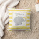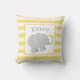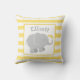 This sunny nursery pillow features a grey elephant with yellow heart accents on a white centre, framed by bright yellow and white stripes. The child's personalised name monogram adds a personalised touch. A cheerful, gender-neutral accent for any nursery, playroom, or toddler room. Customise the name for a thoughtful baby gift.