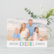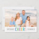 Simple and modern holiday photo card features your photo with multi-coloured "Cheers" wording and custom text for a seasonal message, your family name, and year. The back of the card includes a pattern of diagonal stripes. Cheerful colours, perfect for a summer / vacation photo, include sky blue, mint green, violet purple, golden yellow, turquoise / teal blue, and light pink.