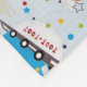 Buses, cars, planes, trains, boats and trucks in fun illustrated pattern on blue.