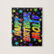 This exciting and fun birthday-themed jigsaw puzzle design features the message "HAPPY BIRTHDAY, MOLLY" with the characters having a colourful rainbow spectrum inspired gradient pattern, along with a lively field of stars background pattern. An exciting puzzle like this might be a fun way to send birthday wishes to somebody named Molly. [~Z0000468]