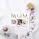 Mother's Day card with the word MOM in real rose gold foil typography and pink roses. It has the word "MOM" in a decorative relief font in rose gold foil, pink rose bouquets, and three photos. The backside has a dusty rose pattern of the word "MOM." Some photos are courtesy of Storytree Studios, Stanford, CA.