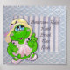 Cute Momma frog is letting everyone know the rules of her bathroom. Light blue background with black lettering.