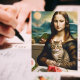 On this dreamy summer night, young Mona Lisa sits serenely with a relaxed tabby cat in her lap. A glowing full moon lights up the enchanted forest behind them, while a juicy slice of watermelon rests invitingly at the table. They look like they've just shared a sweet secret—or maybe just a snack. The cat seems convinced it's royalty. It’s a perfect little pause in time, where summer silliness meets classic charm.
