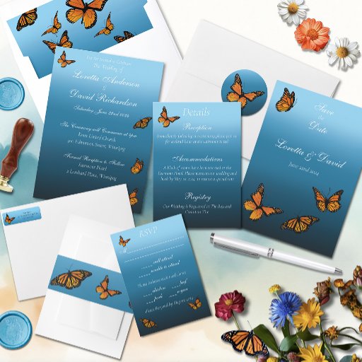 Elegant monarch butterflies in orange against a blue ombre background, creating a romantic and nature-inspired design. Perfect for outdoor, garden, or butterfly-themed weddings.