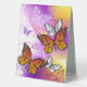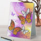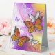 Orange, detailed monarch butterflies on light, purple, picturesque, painted background.