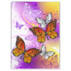 Orange, detailed monarch butterflies on light, purple, picturesque, painted background.