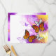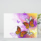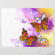 Orange, detailed monarch butterflies on light, purple, picturesque, painted background.