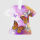 Orange, detailed monarch butterflies on light, purple, picturesque, painted background.