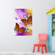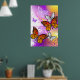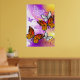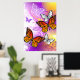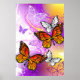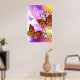 Orange, detailed monarch butterflies on light, purple, picturesque, painted background.
