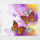 Orange, detailed monarch butterflies on light, purple, picturesque, painted background.