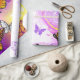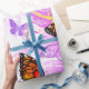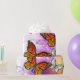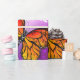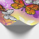Orange, detailed monarch butterflies on light, purple, picturesque, painted background.