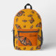 Girls backpack with monarch butterfly pattern and place for her name. Colours are orange, gold, and black. The name is in black script next to a big butterfly image. Perfect for school or travel.