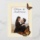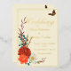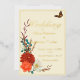 Elegant Gold foil invitation lettering on an ivory background is complemented by colourful autumn dahlias, roses, anemone, wheat stalks and monarch butterflies to make a striking but simple wedding invitation. The Monarch butterfly emphasizes the gold foil text on the front and the couple photo on the back for a truly autumnal wedding theme.