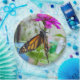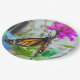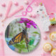 A photograph of a Monarch Butterfly resting on a pink Zinnia flower, printed on paper plates.